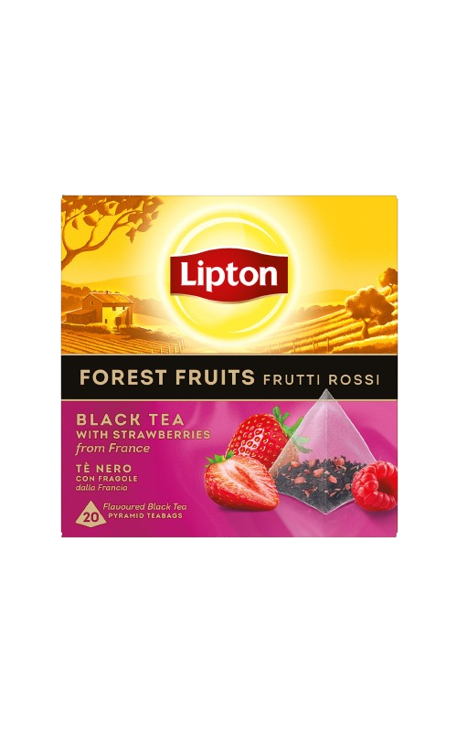 Black tea, forest berry flavoring identical to natural, wild berry mixture (raspberry, red currant, cherry, blackberry), strawberry pieces.