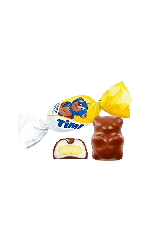 Glazed candies in the shape of a teddy bear with delicate souffle with cream and banana flavors.