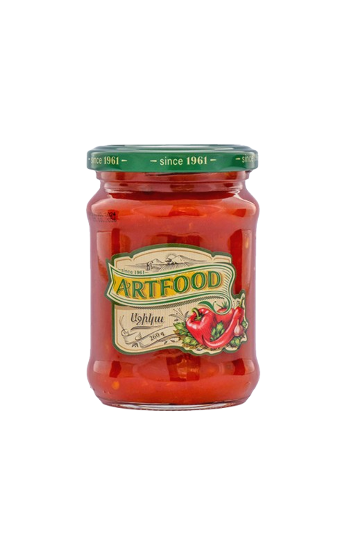 Adjika Store at a temperature of +5°C to +20°C. Ingredients Red sweet pepper, red hot pepper, tomato paste, ground red pepper, garlic, sugar, salt, ground coriander, vegetable oil. Kilocalories 100 g / 61 g Protein 100 g /1 g Fats 100 g /4.5 g Carbohydrates 100 g /4.5 g