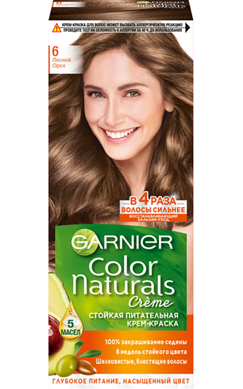 Hair dye, color: huzelnut, with olive, avocado and carite oils. You can find cream hair dye, milk revealing reagent, cream-care after dying, a pair of gloves and instruction booklet in the package.