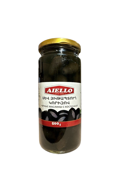 Sterilized black olives, pitted. Store at a temperature of 0°C to 20°C and a relative humidity of no more than 75%. Ingredients Olives, water, salt, iron gluconate. Kilocalories 100 g / 190 g Protein 100 g / 1.5 g Fats 100 g / 18 g Carbohydrates 100 g / 5 g