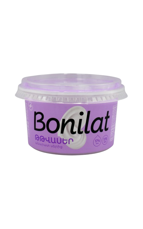 Sour cream from 100% pure pasteurized milk, fat content 17%. Store at a temperature of 2-6°C and a relative humidity of no more than 75%. Ingredients Milk cream normalized, bacterial curd. Kilocalories 100 g / 175 g Protein 100 g / 2.6 g Fats 100 g / 17 g Carbohydrates 100 g / 3 g