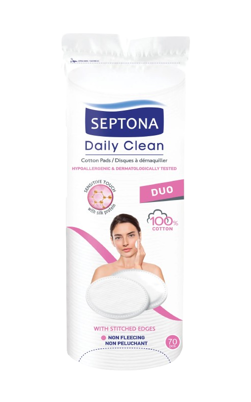 These cotton pads are often used for make-up removing. SEPTONA Daily Clean Sensitive Touch Duo round double-sided discs with silk proteins are made of 100% cotton. They clean effectively, as they have one pink side for the eye area and sensitive areas and one white side for the face. With stitched edges. Ideal for the most sensitive areas of the face. Hypoallergenic, dermatologically tested