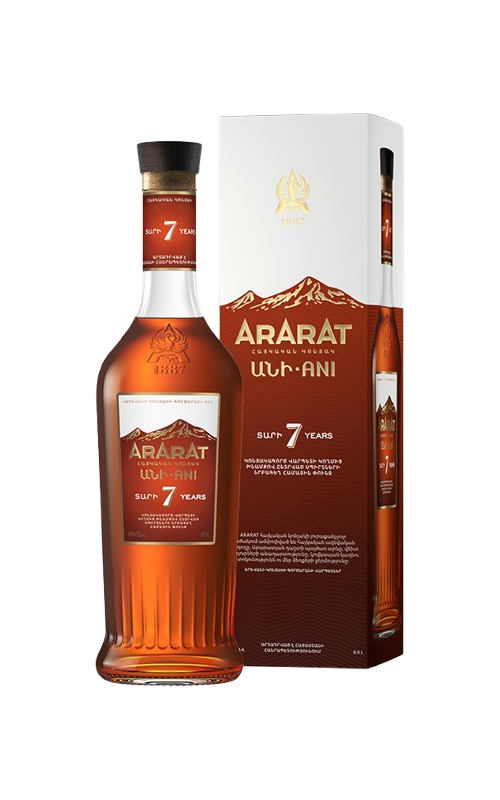 "Կոնյակ՝ 7 տարվա հնեցման, ալկ. 40%: Ararat հայկական կոնյակի յուրաքանչյուր բաժակում ամփոփված են հայկական ազնվական խաղողը, Արարատյան դաշտի պայծառ արևը, վճիտ աղբյուրների անաղարտությունը, կովկասյան կաղնու տոկունությունն ու մեր ձեռքերի ջերմությունը: