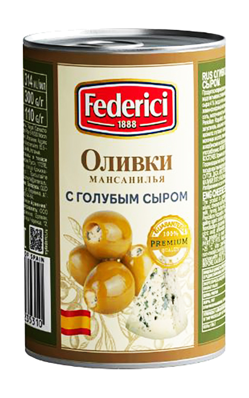 Կանաչ ձիթապտուղ՝ բորբոսով պանրով։ Նկարագրություն: Խմելու ջուր, առանց կորիզի ձիթապտուղներ, կապույտ պանրի մածուկ (խմելու ջուր, կապույտ պանիր (պաստերիզացված կովի կաթ, մածուկ, թան, աղ, կաթնաթթվային բակտերիաներ, Penicillum Roqueforti կաղապարներ, էմուլգատոր՝ նատրիումի ֆոսֆատներ), խտացուցիչ՝ նատրիումի ալգինատ, աղ, համ և բուրմունք ուժեղացուցիչ՝ մոնոսոդիումի գլյուտամատ՝ կաթնաթթու, կիտրոնաթթու՝ ասկորբինաթթու;
