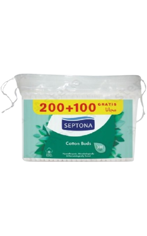 Բամբակյա փայտիկներ: SEPTONA բամբակյա փայտիկներ՝ փափուկ ծայրերով՝ պատրաստված 100% բամբակից: Ապահովում է նուրբ մաքրում և բնական խնամք: Առկա է նաև պոլիէթիլենային տոպրակներում՝ 200 հատ և 100 հատ: