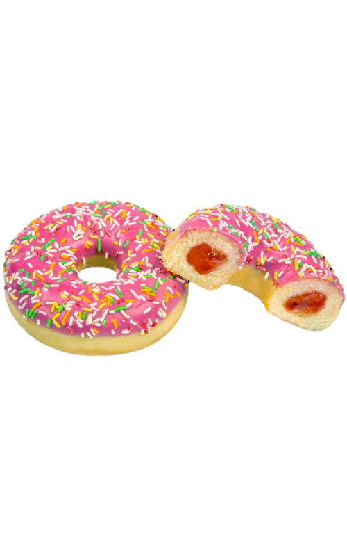 Դոնատ ելակի համով և զարդանախշ ջնարակով, սառեցված վիճակում։