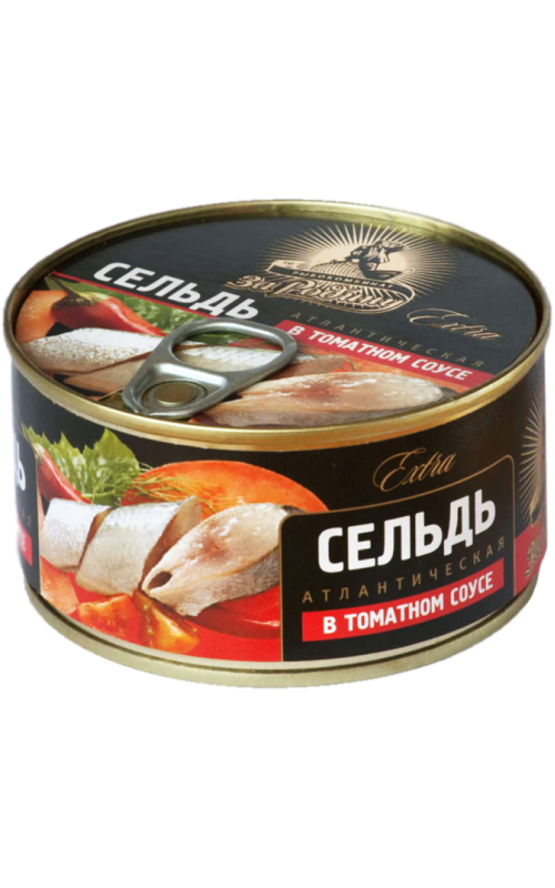 Стерилизованные рыбные консервы: куски Атлантической сельди в томатном соусе.