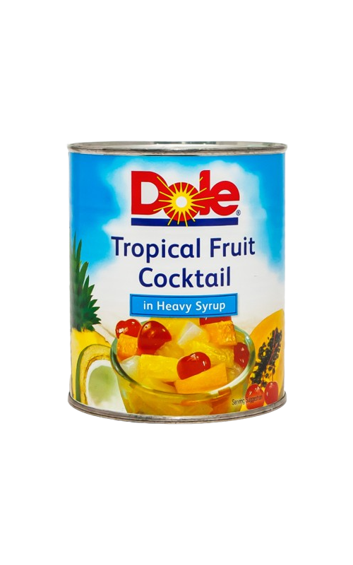 Тропический фруктовый коктейль Dol в сиропе со вкусом тропических фруктов. После вскрытия переложить в стеклянную или пластиковую емкость. Хранить в прохладном и сухом месте при температуре 0–25 °C. Состав: Фрукты в различных пропорциях: ананас, красная или желтая папайя, вишня. Килокалории: 100 г / 85 г Белки: 100 г / 0,4 г Углеводы: 100 г / 20 г