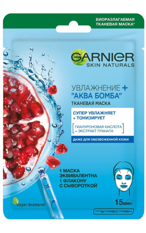 Тканевая маска увлажняющая: экстракт граната + гиалуроновая кислота + увлажняющая сыворотка.