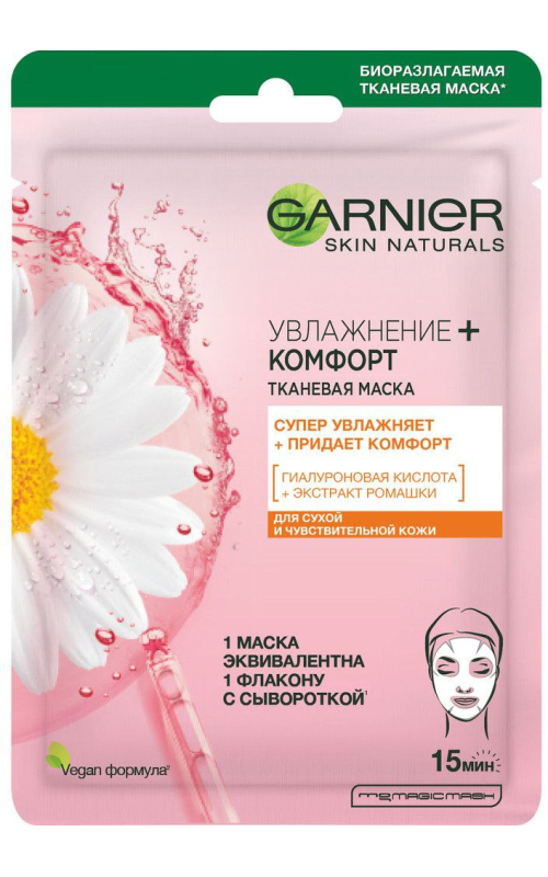 Тканевая маска увлажняющая: экстракт ромашки + гиалуроновая кислота + увлажняющая сыворотка.